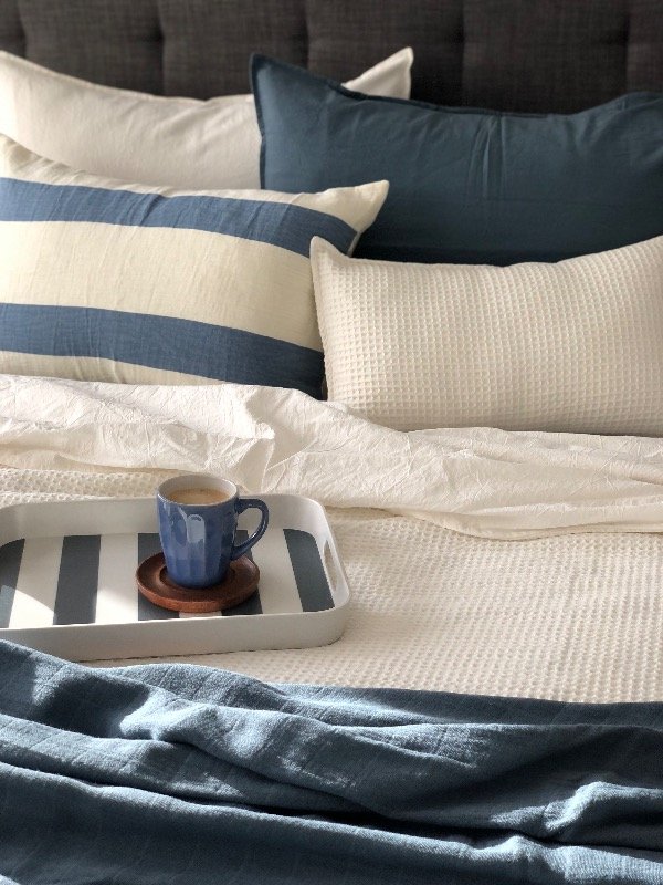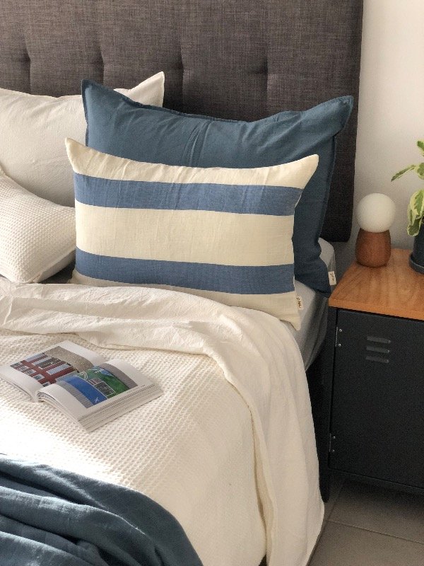 ¡Nuevo! Este almohadón combina una tela a rayas que es suave y se parece a la textura del bambú con tusor liso crudo en el dorso, súper cancheros y descontracturados, ¡toda la onda! 🙌🏼