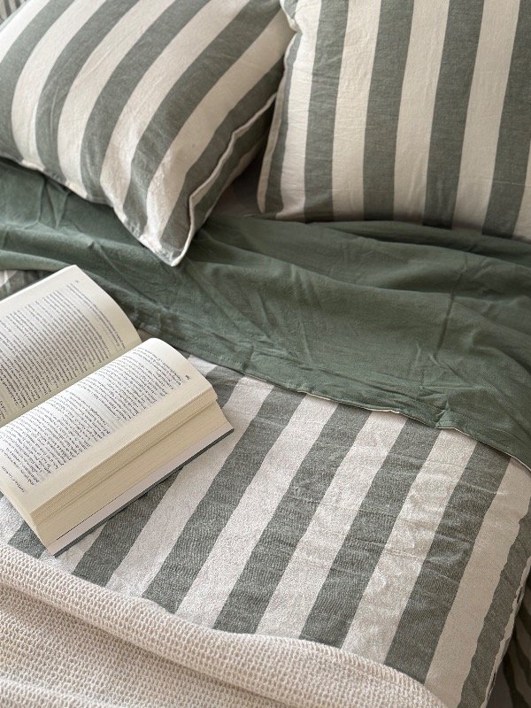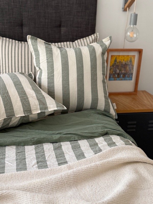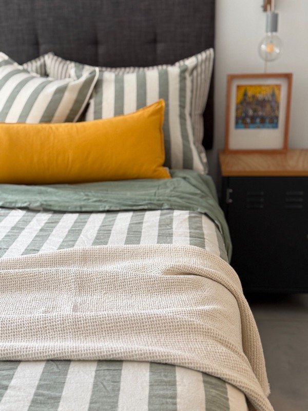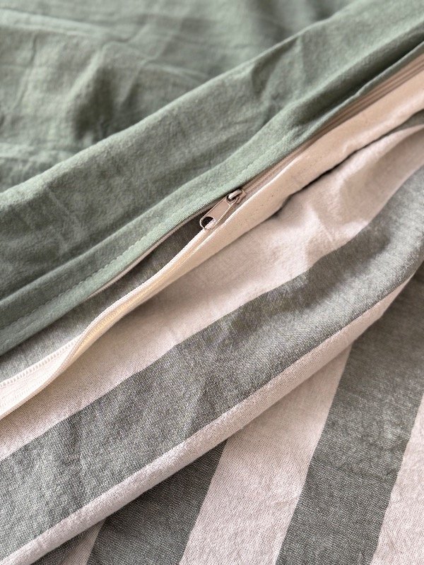 Cubre edredón confeccionado un lado en Tusor Rayado (fajas de 4cm) y del otro Tusor liso 100% algodón, reversible y con cierre oculto en un lateral.